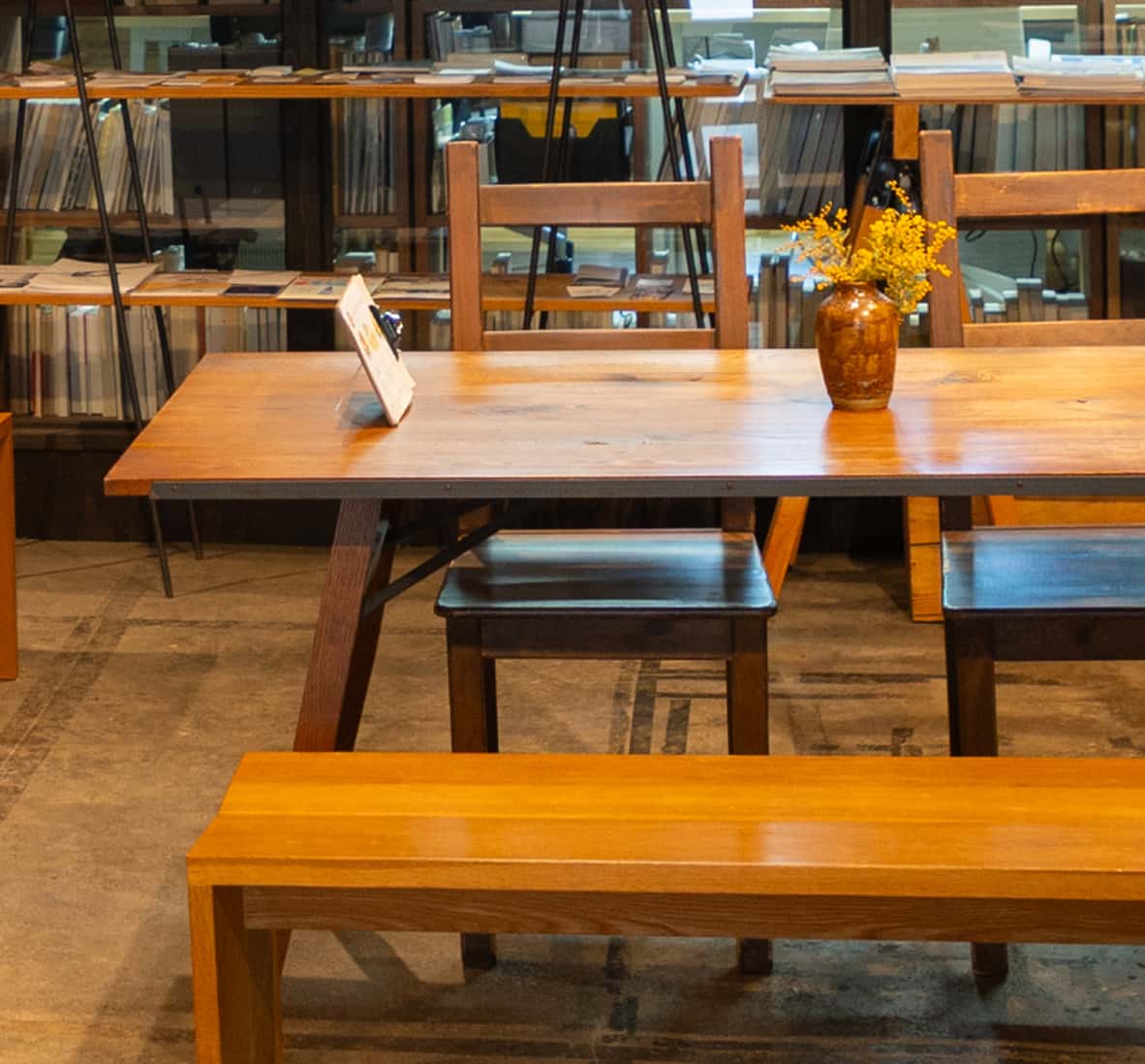 元食品卸会社の倉庫を改装。天井の高さを活かして、板壁などはそのままに、大きなテーブルを配した居心地のいい空間になっている。