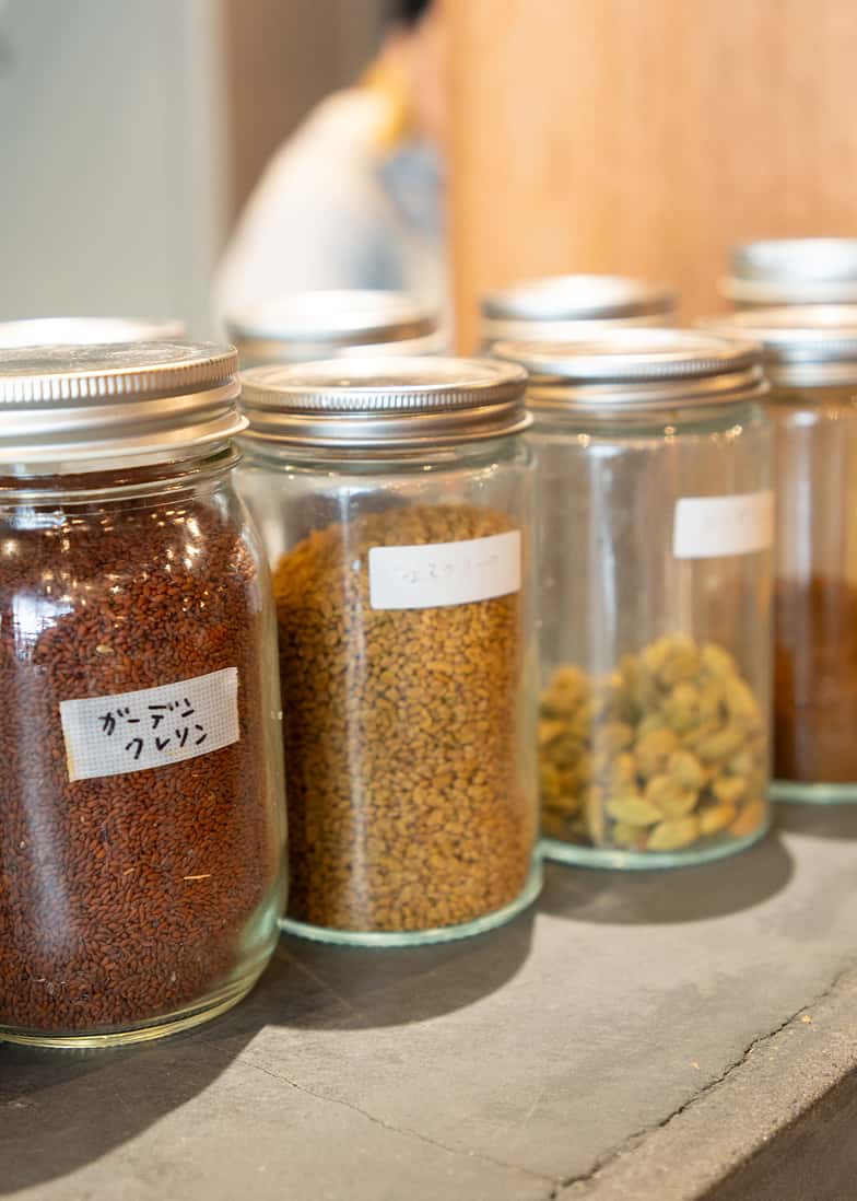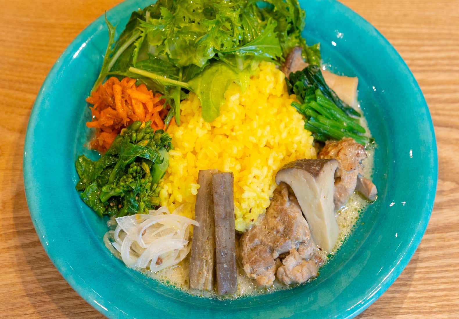 播磨産の米を色鮮やかに炊き上げたターメリックライスを中心に、クミンであえたキャロットラペ、マスタードシードで炒めたホウレン草、菜の花のからしあえ、タマネギのピクルスなどが並ぶ。ワサビ菜や水菜など5種の葉物サラダは、岩塩とオリーブオイルだけのシンプルなスタイルで。味にメリハリのある野菜をふんだんに盛り込んだ見事なプレート。スパイスは姫路港近くの卸会社からの直送で、15種ほどを巧みに配合しながら野菜のうまさを引き出している。。
