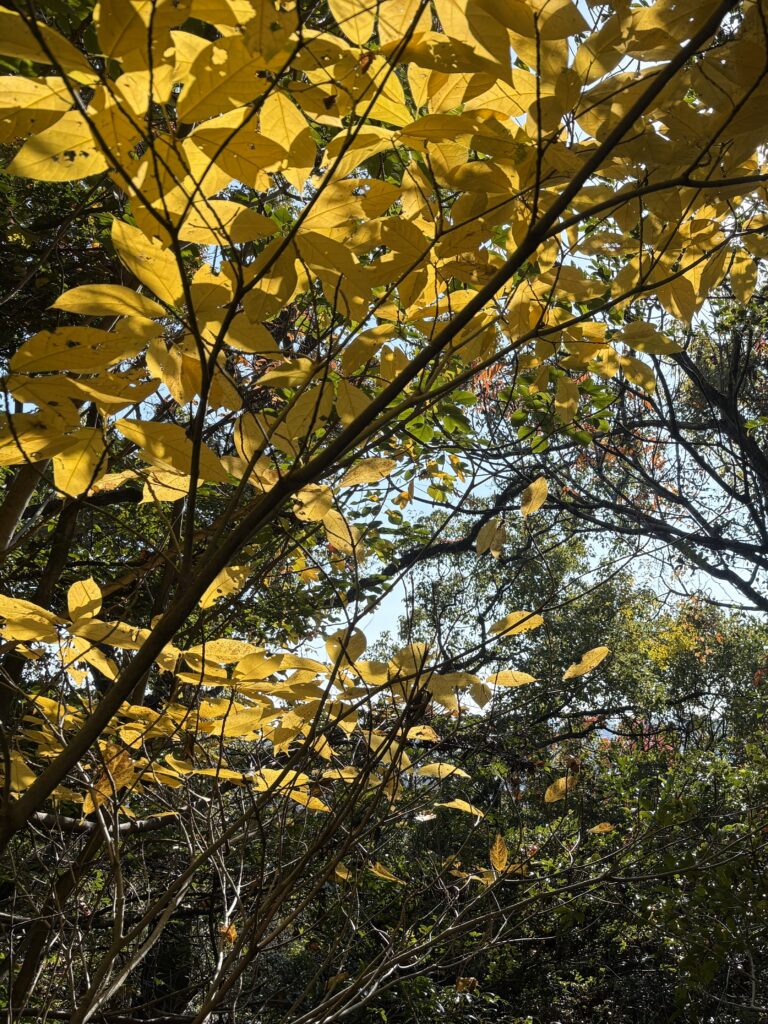 晩秋の澄んだ空気の中、紅葉した木々を眺めながら登ります。