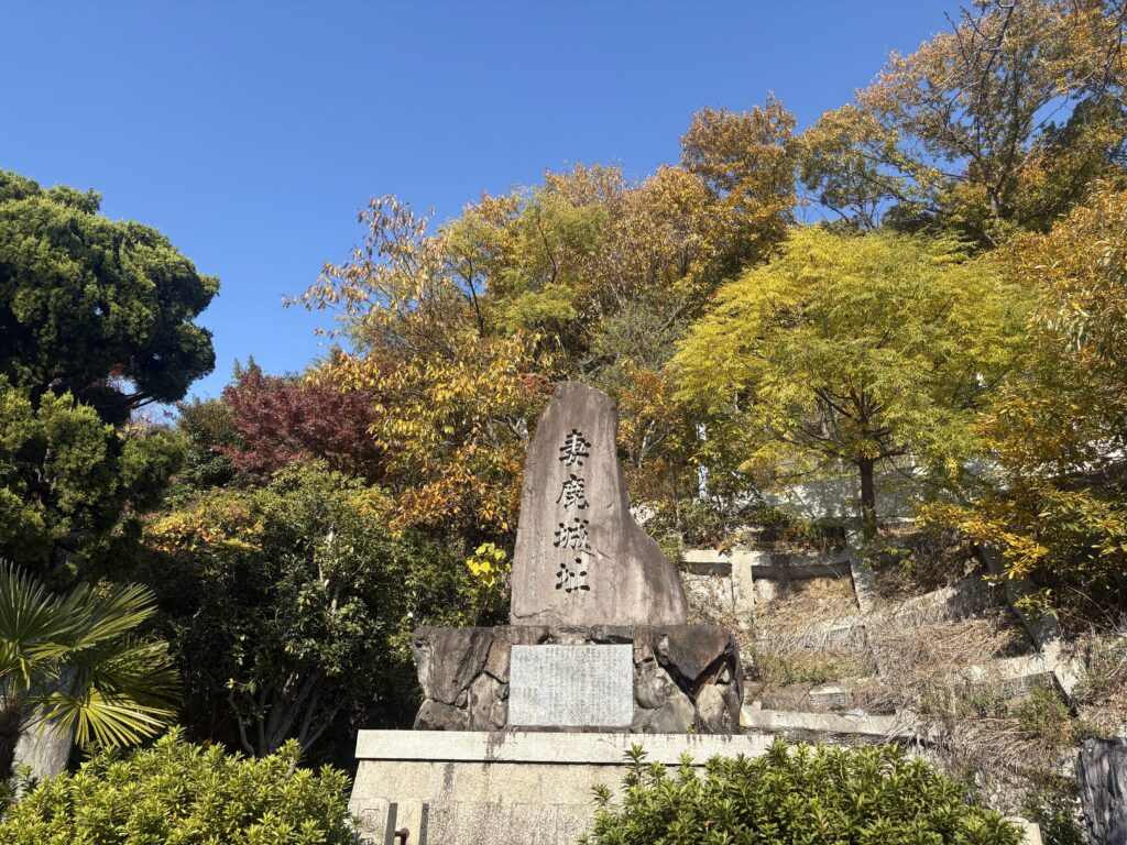 妻鹿駅から10分ぐらい歩くと、荒神社の中にある「妻鹿城址」の石碑があります。