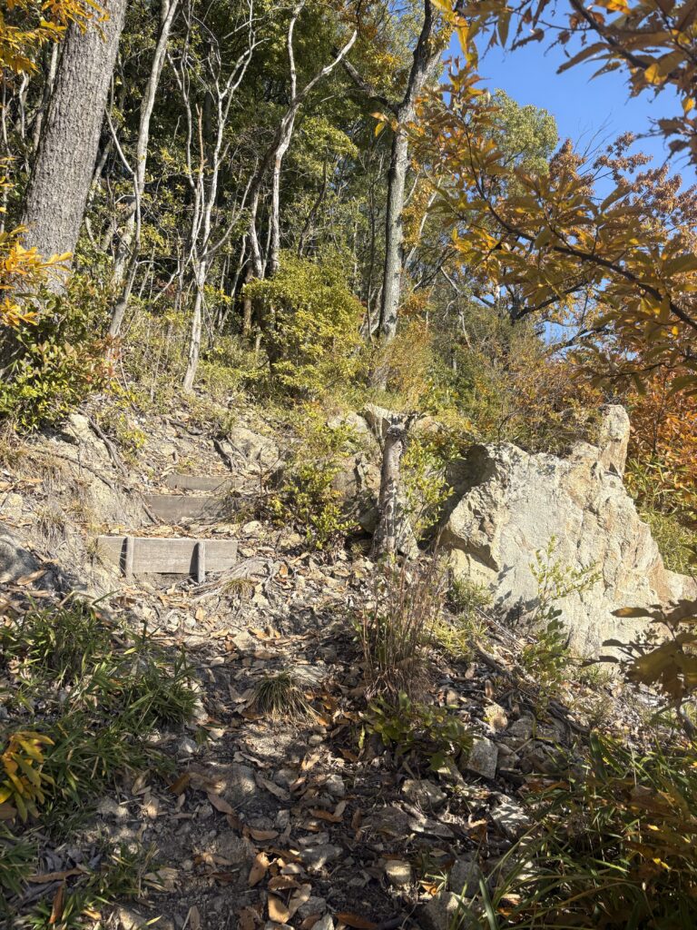息が切れるほど急な斜面ではありませんが、下りのことを考えるとやはり登山用のストックがあると安心です。