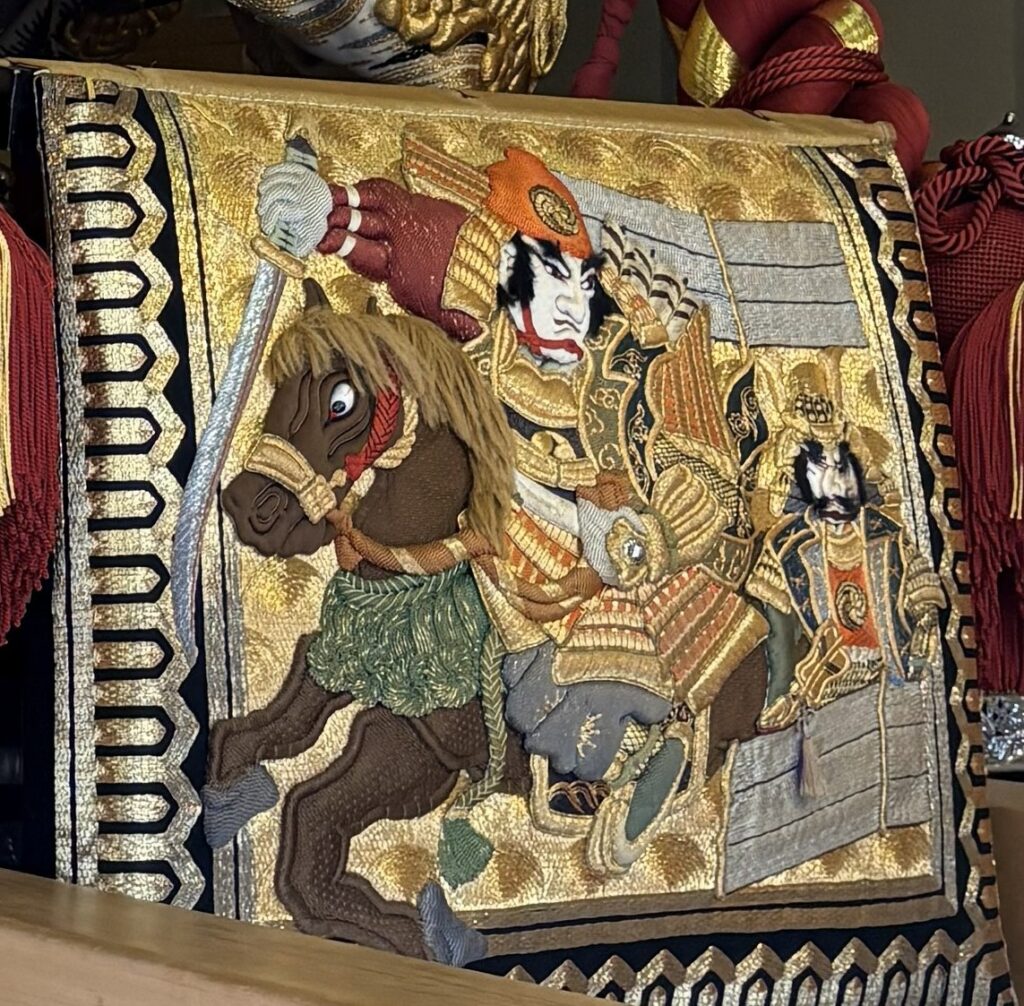 高欄掛けは、屋台の中で太鼓を打つ人が座る「高欄」の四方に取り付ける刺繍品です。