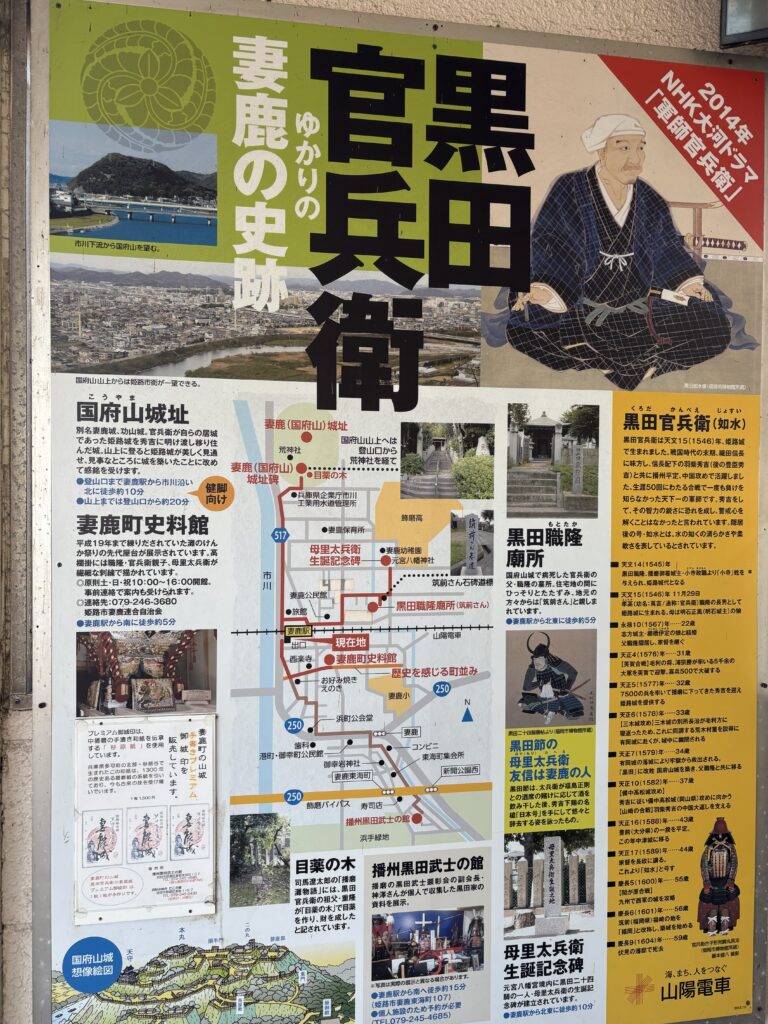 妻鹿駅の改札を出たところには黒田官兵衛の史跡についての案内板があります。