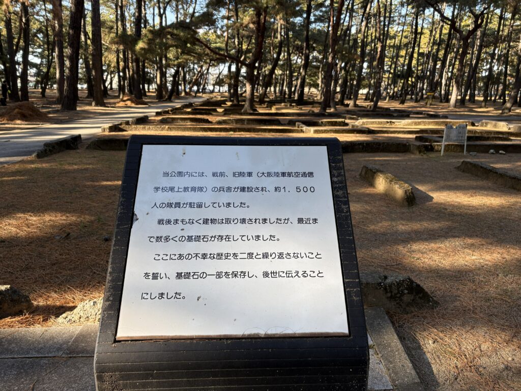 1937年(昭和12年)には陸軍加古川飛行場(通称:尾上飛行場)ができ、戦争激化とともに陸軍航空通信学校尾上教育隊が開設され、浜の宮公園あたりに多数の兵舎が建てられていたそうです。