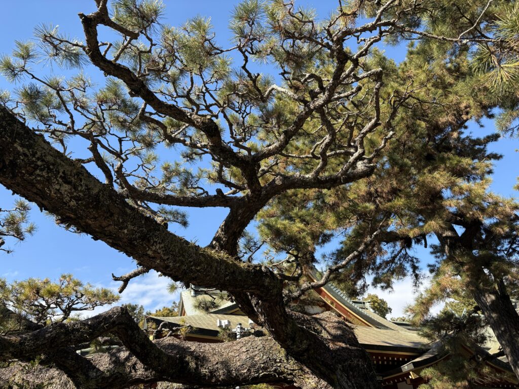 道真公が眠る九州の方角へ枝を伸ばしていると言われています。