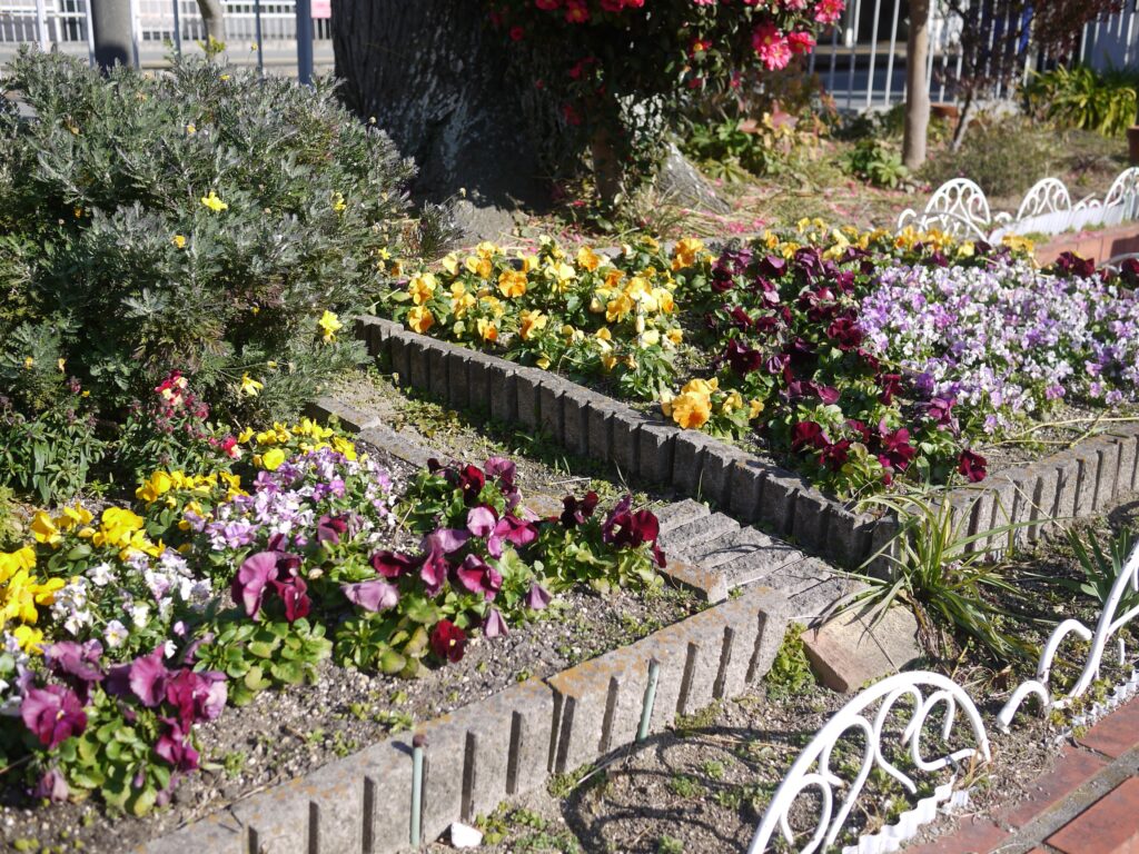 駅舎横の手入れされた花壇では、冬にもかかわらずきれいな花が咲いていました。