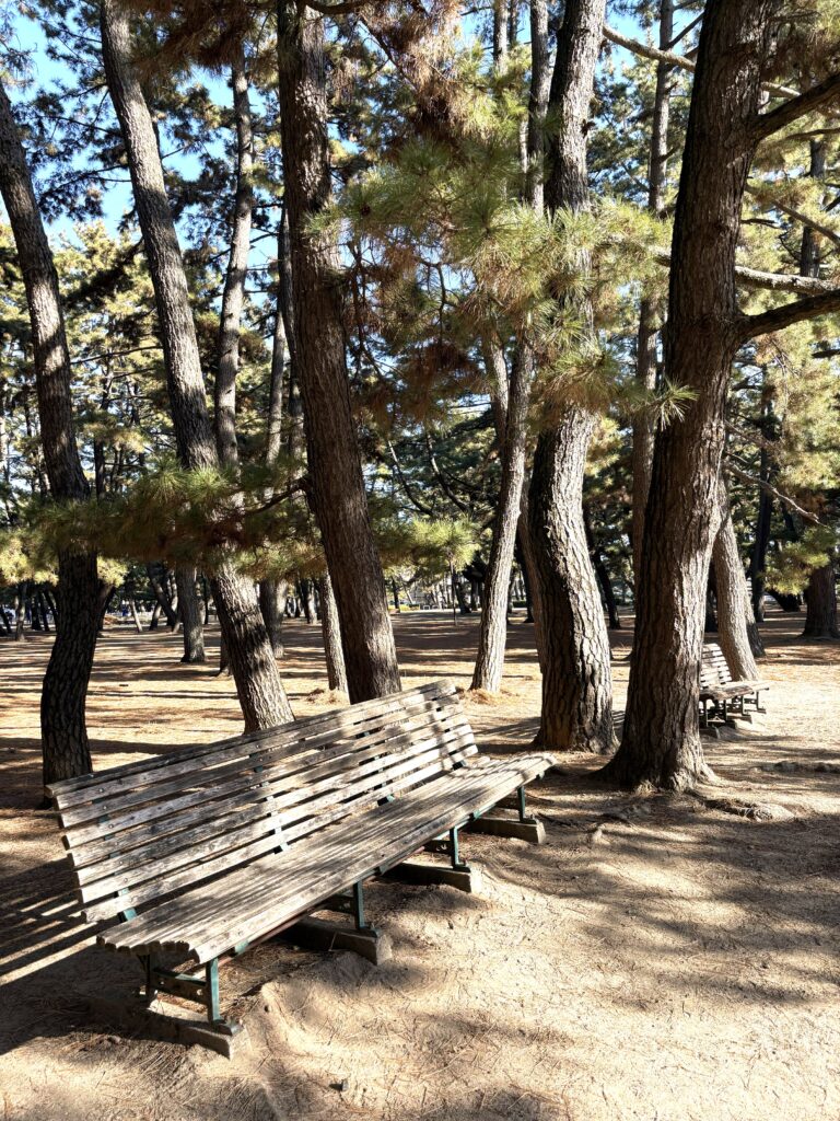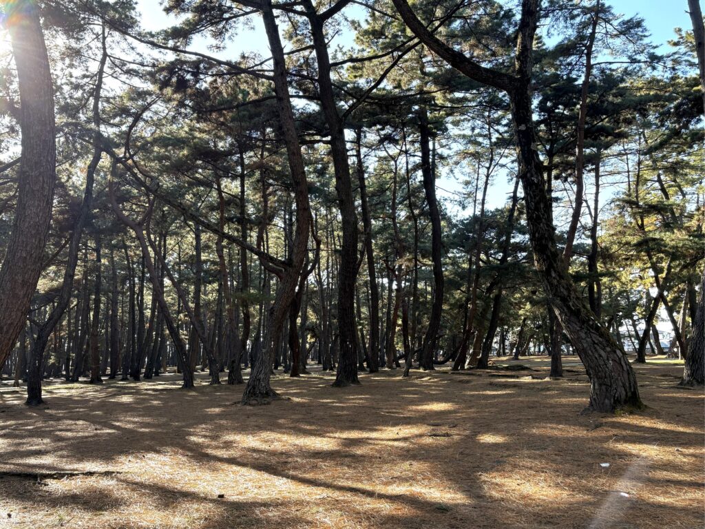 冬の澄んだ青空の下、松林をゆっくり散策するのも、気持ちがよいものです。