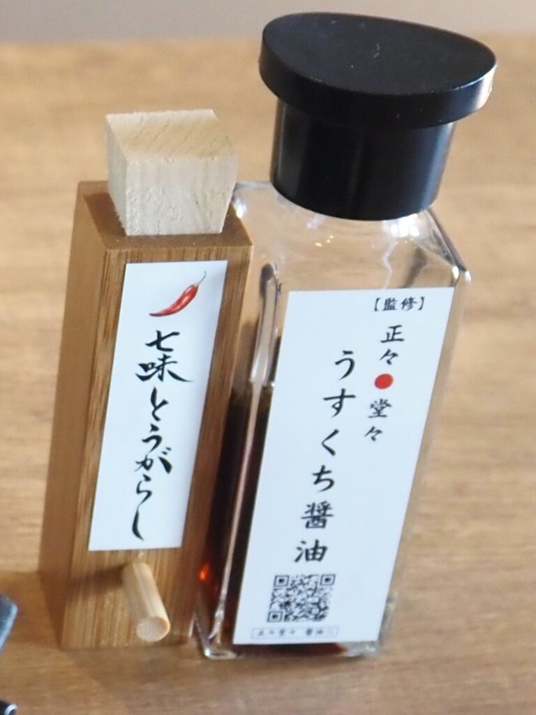 醤油は、籠谷さんが考案した、ウルメイワシと唐辛子入りの「生々堂々」という名前のうすくち醤油です。