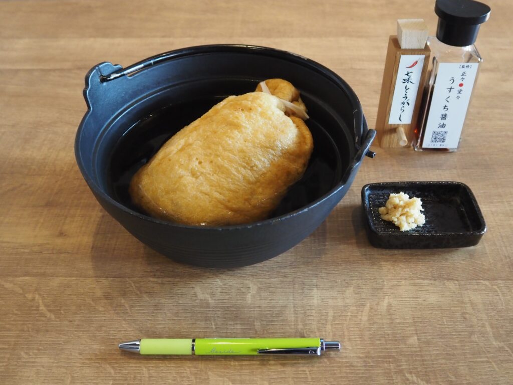 うどんを含め、ボリュームたっぷりの8種の具材を包みこむため、油揚げは特注の品。