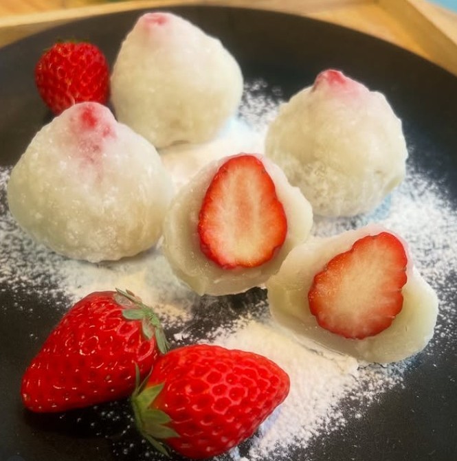 季節限定の「いちご大福」(370円)は、自ら仕入れに行った朝採れの苺を、べつばら特製あんをやわらかな餅で包んでいます。