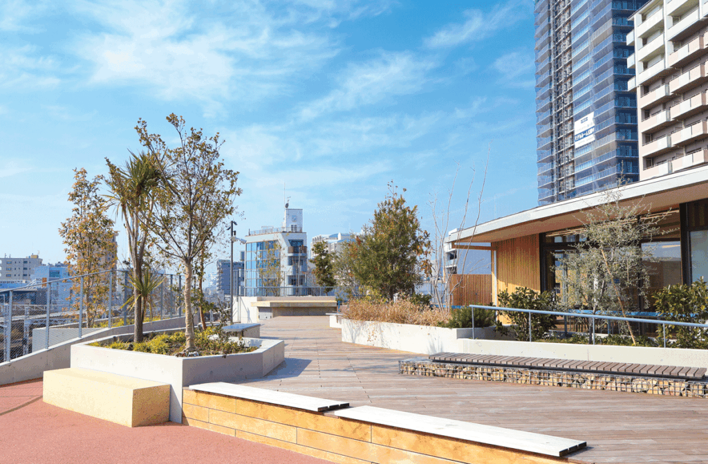 山陽電車が眺められる2階の電車テラスや4階の屋上ひろばなど、憩いの場も充実。
