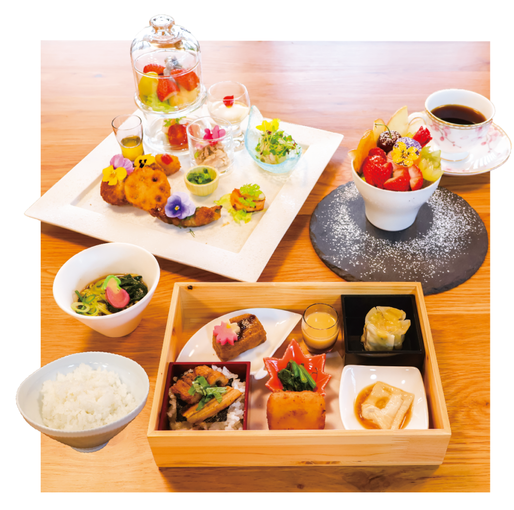 淡路産の穴子丼や生麩などが木箱に入った和創作料理、旬の魚介カルパッチョや肉巻きに花びらが舞う洋風創作プレートなど至極の20品。