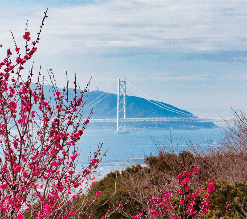 紅白約660本の梅越しに、明石海峡大橋や淡路島を一望できる絶景スポット。