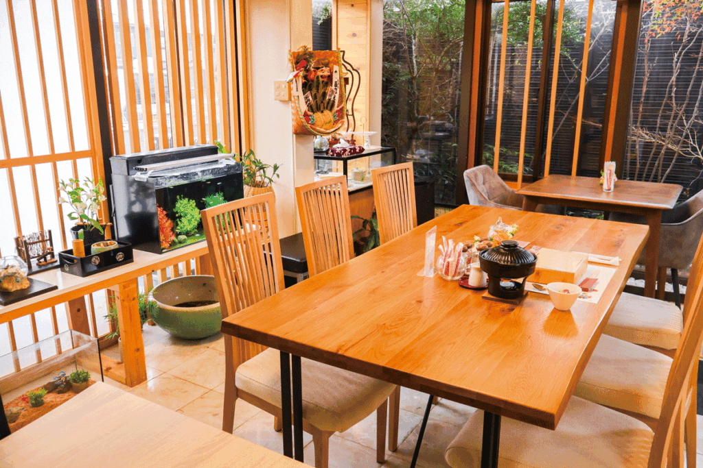 数々のめだか鉢が並ぶエントランスを通ると、一流の茶器や趣あるしつらえに心安らぐ店内へ。
