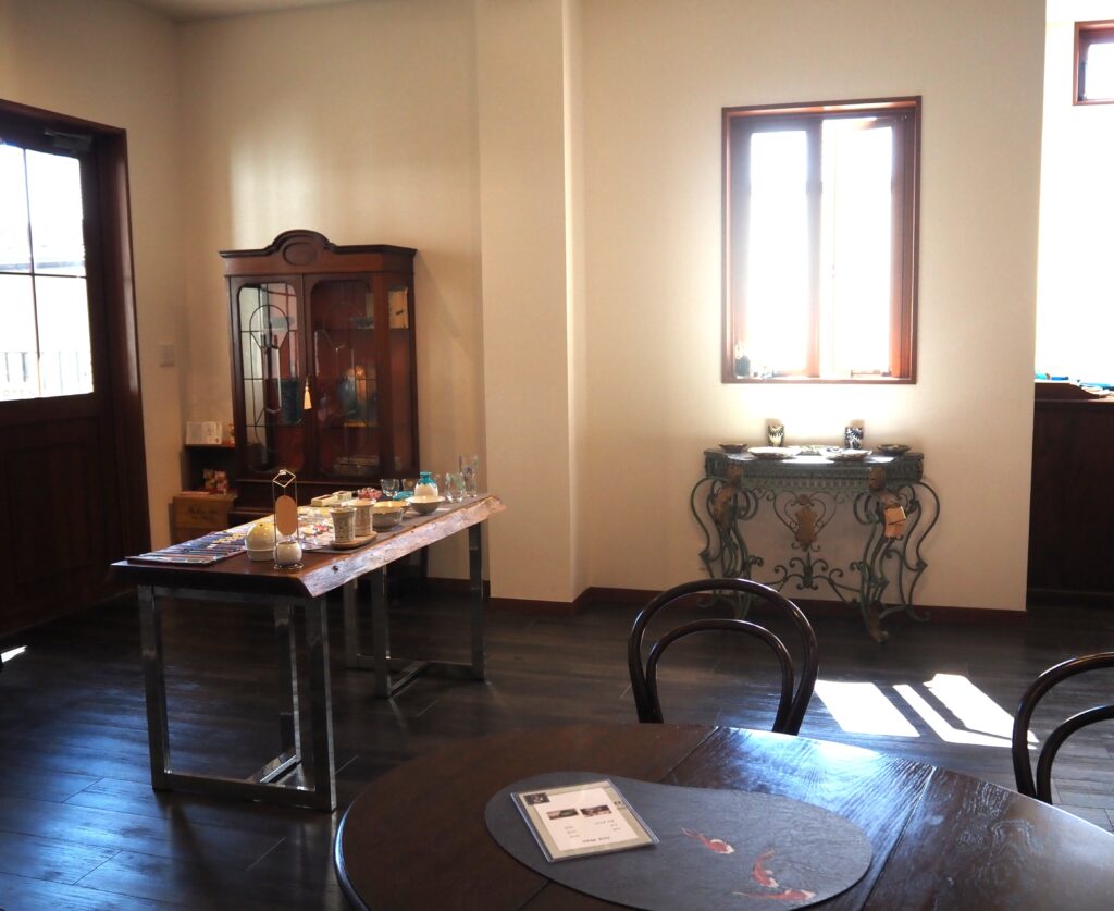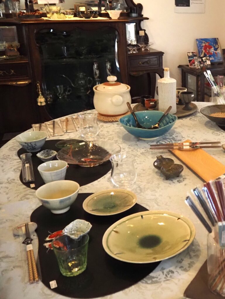 アンティーク家具が配置された店内に、小坂さんが選んだ陶器や磁器、漆器、工芸品が並んでいます。