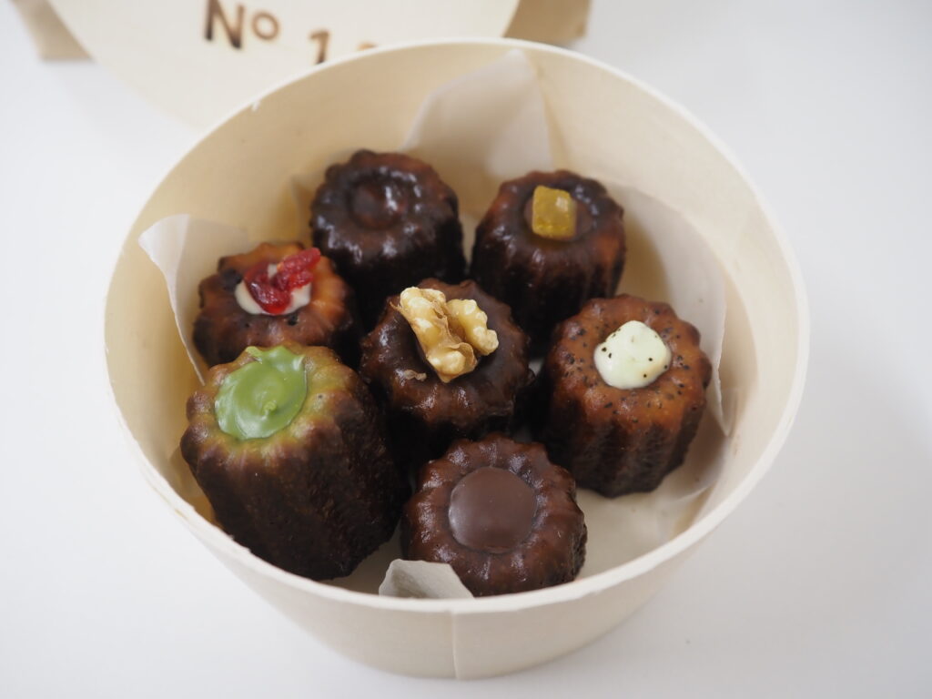 カヌレは1個170円。プレーン、チョコ、抹茶、オレンジ、クランベリーなど。
